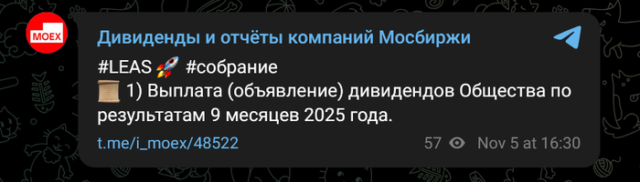 Здесь мы видим, как несколько каналов практически одновременно опубликовали новость о рекомендациях по дивидендам. Канал i_moex оказался самым быстрым.