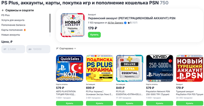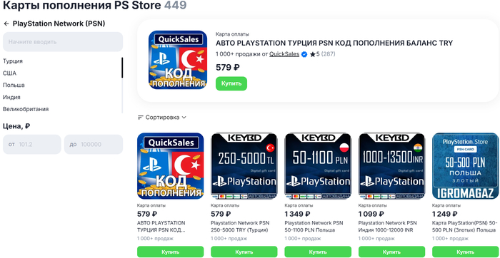 Есть два варианта закинуть кровные на внутренний баланс PSN — покупка прямого пополнения / карты пополнения в зависимости от региона. После активации приобретенной карты на аккаунт зачислится эквивалентная ей сумма. При покупке услуги пополнения, на баланс поступят средства в указанном вами перед оплатой количестве. Как карты, так и прямое пополнение можно приобрести на ggsel. Положительная сторона метода карт пополнений (Турция, Индия, Польша) — нам не придется давать данные от учетной записи. А в некоторых случаях это еще и самый выгодный вариант.