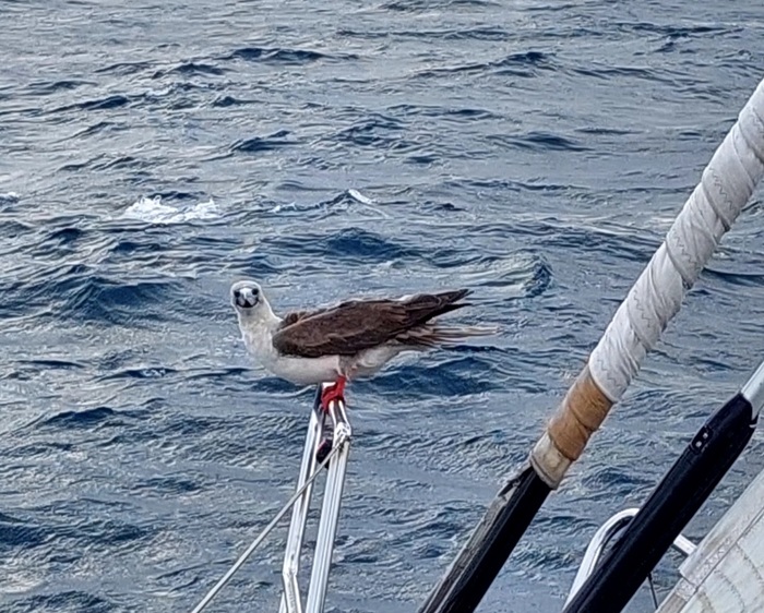 Это на подходе, наглые олуши захватили яхту уселись как у себя дома, а те кто не смог приземлится крутили вокруг парусов. Спугнуть их не представлялось возможным, так что я через какое-то время махнула на них рукой и пошла греться, тк хоть мы и были почти на экваторе, но из-за течения Гумбольдт вода - холодная и температура воздуха градусов 20.