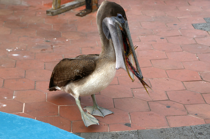 В аэропорту все было как при прилете в международный аэропорт. То есть очередь к кабинкам, в каждой кабинке с каждого бледнолицего содрали по 100 долларов, выдав взамен что-то типа визы, красивую такую картонку, даже с голограммой. И в утешение еще и карту Галапагосских островов, портативную и складную. Ну а вдруг кто не знает названия всех островов. Я-то знаю, со школы еше, я в школе был ботан еще тот, но не все ж такие. Потом всю толпу собрали у места выдачи багажа, но к багажу не подпустили. Там у них аэропортик маленький, карусели для багажа нет, вместо нее три или четыре таких коротеньких транспортера, пока мы стояли к кабинкам, грузчики накидали наши чемоданы. Чемоданов получилось почему-то сильно дофига. Не знаю, чего народ туда везет, вроде как вечерние платья там носить особо некуда, шлепки да шорты - что там еще надо? Ну правда, мы тоже привезли по чемодану. Гидрокостюмы там, маски-ласты, один чехол для подводной съемки к фотику полчемодана занимает. Но это - мы. Зачем это все другим-то? :-)