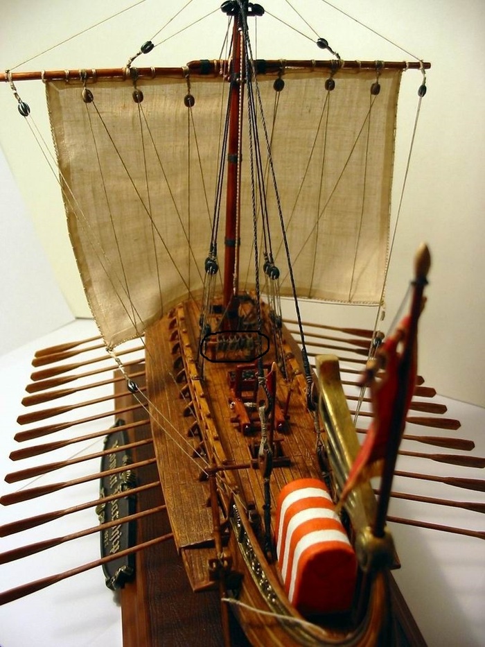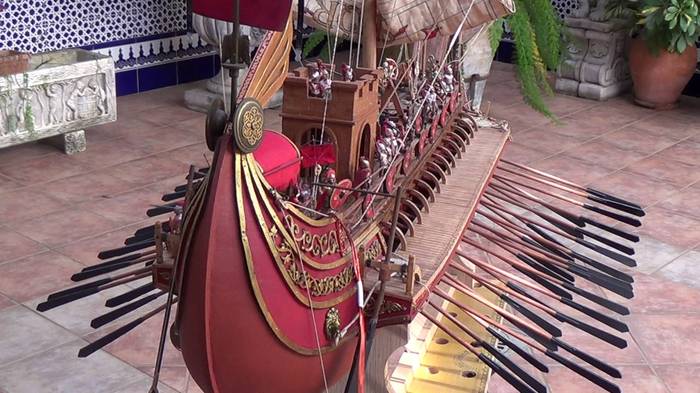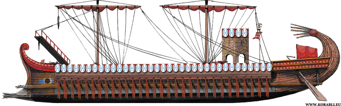 Это боевой корабль с тремя рядами вёсел, на двух вёслах сидело по два гребца, на одном – один, всего пять. Расположение в пять рядов никто уже просто в здравом уме не рассматривает. Число весел в одном ряду доходило до 25, водоизмещение свыше 200 т, длина 45 м, ширина 6 м, осадка 2,5 м, экипаж около 250 чел. Для согласования гребли применялись канатное соединение вёсел одного ряда и упоры, ограничивающие величину гребка. Вооружались восемью камнемётами, имели по 300 морпехов и их построили в разных модификациях 500 шт.