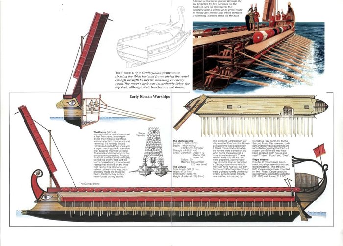 Водоизмещение квадрирем составляло более 250 тонн, а экипаж — 260 человек, носовая часть оборудовалась тараном, на вооружении квадрирем состояли абордажные вороны и разнообразные метательные машины. Это уже бронепалубные крейсеры, их тоже было довольно много, они успели повоевать.