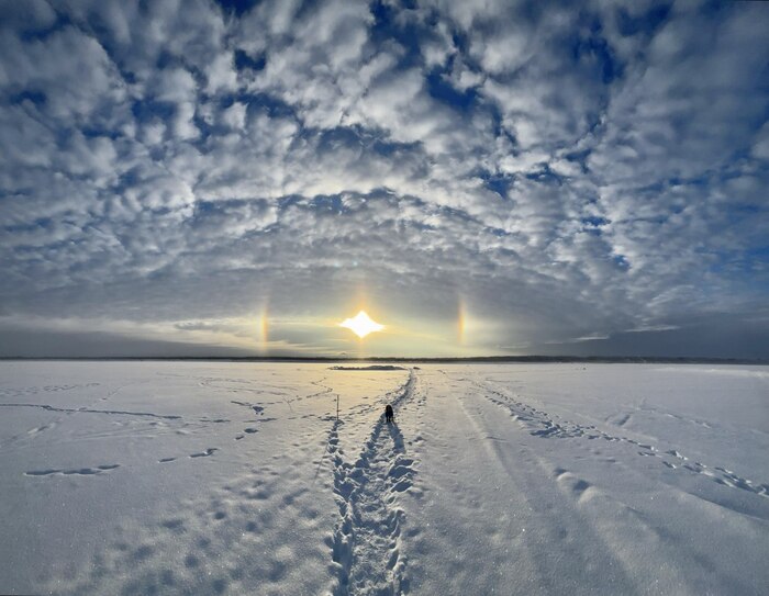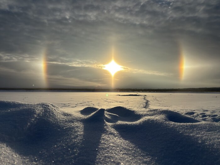 Гало - это атмосферное оптическое явлений в виде светящихся кругов вокруг Солнца (но в принципе и с другими источниками света тоже может быть) из-за преломления и отражения света в кристаллах льда в атмосфере, что создаёт эффект нимба или ореола. Это явление происходит в морозную погоду или при определённых облаках.