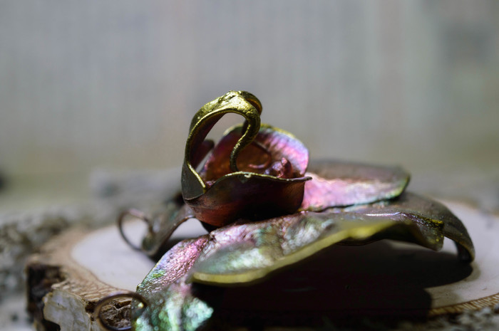 @NphERNO на самом деле умеет делать гальванопластику гораздо лучше, чем показал :-) Вот тут все медные листочки (это мои украшения разных лет, давние в основном, сейчас я гальваникой почти не занимаюсь) - его работа. Листья роз на браслетах, желудь, "крылатка" ясеня, листочки пишты и сирени. Все они на самом деле блестят при полировке, а особо красиво смотрится кайма из ... шариков таких крохотных, вроде как окалина, я сама так делать не научилась.