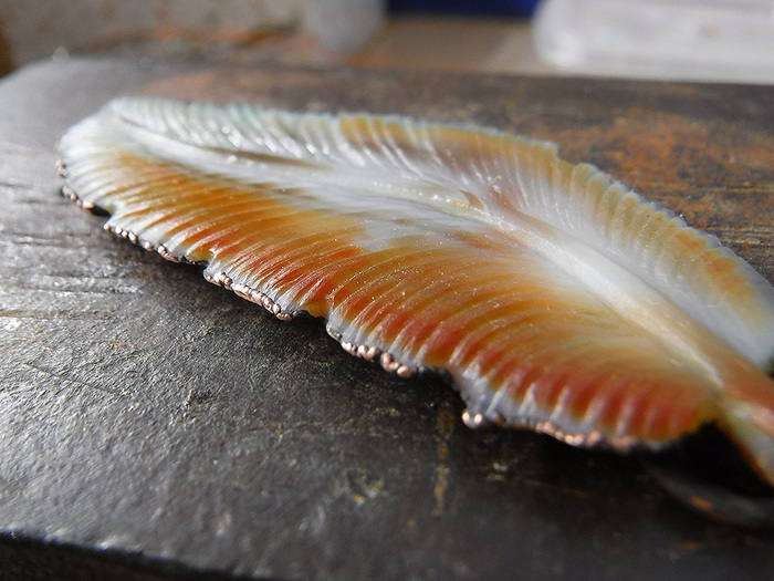 Пример готовой работы. Натуральный лист дуба покрыт медью. Патинирование серной мазью.