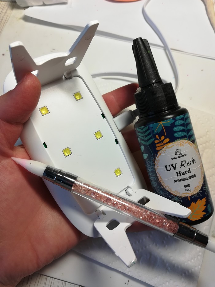 Дальше сверху кладётся прозрачный напечатанный узор (можно положить что угодно, там, где будет тень, там будет гравировка) и минут на 8-10 включается ультрафиолетовая лампа. Дальше снова прогладить утюгом, снять с фоторезиста второй защитный слой и опустить в воду с кальцинированной содой (у меня под рукой не было, поэтому воспользовался пищевой содой, тоже сработало). Незасвеченные участки через несколько минут растворяются.