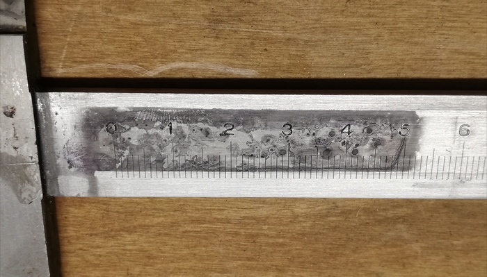 Дальше наматываем немного ваты на гвоздь (у меня саморез, на него вату наматывать легче), подключаем минус к стамеске, плюс к гвоздю, мочим вату в солёной воде и водим по металлу. Металл темнеет. Если подключить наоборот, плюс на стамеску, можно сделать не затемнения, а реальные углубления в металле. Или, меняя полярность, сначала сделать углубления, потом их затемнить. Потом счищаются остатки фоторезиста. Общий результат в первой картинке. Это гравировка, которая не стирается.