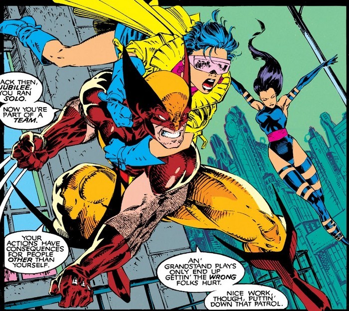 Видали, какое мясо творится на обложке комикса Uncanny X-Men #271, а? Это 1990-е, привыкайте. Так-то история из предыдущего выпуска продолжается в комиксе New Mutants, это такой маркетинговый ход, чтобы заставить покупать сразу несколько комиксов. Я же иду по порядку по одному тайтлу, так что могут быть разрывы в сюжете. Итак – дело происходит на Дженоше. Риктор и Бум Бум (Табита Смит) убегают от силовиков. Ситуация фиговая – силушку мутантам дистанционно отключили, а как только их поймают, то казнят, за неподчинение людям. Впрочем, на выручку приходят Росомаха, Псилок и Джубили! После быстрой схватки и знакомства (Джубили-то с Новыми Мутантами не знакома) Псилок с помощью телепатического сканирования обрисовывает ситуацию. Гроза бегает в другой части острова, Вольсбейн – всё ещё в плену в Цитадели, но и подмога не за горами – Люди-Икс и Новые Мутанты уже на Дженоше и готовятся спасать и выручать. Нужно с ними воссоединиться – и не сдохнуть по пути!