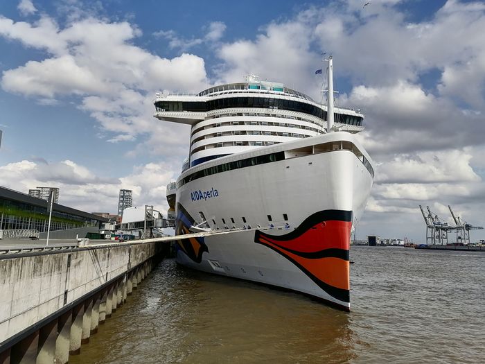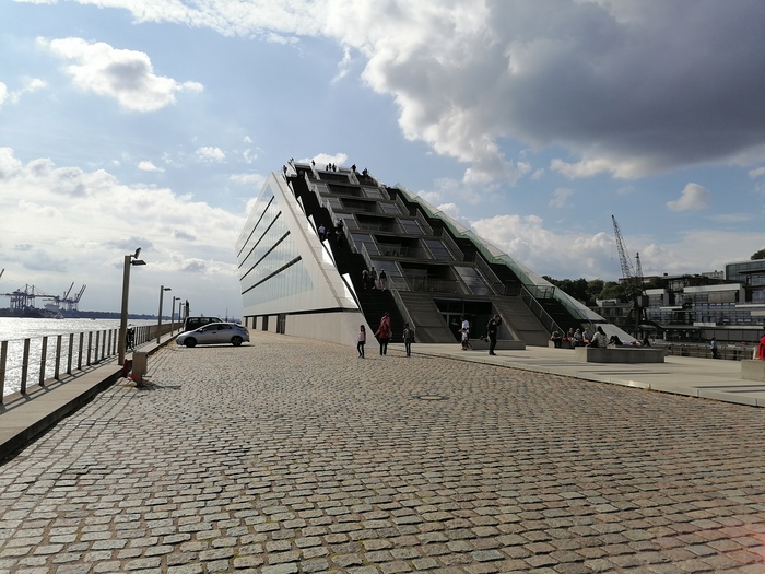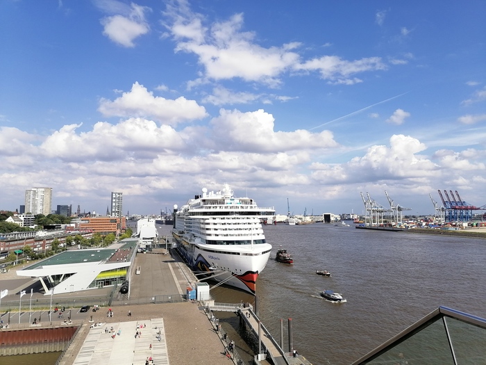 После посещения «Рикмерса» мы направились к ближайшему причалу,дабы прокатиться на речном автобусе.Народу на причал набилось прилично и первый катер ушёл без нас.Заскочив на следующий и проплыв пару остановок мы высадились прямо около пришвартованного круизного лайнера «Аида».А лайнер был пришвартован как раз около знаменитого Докленд офиса.Те, кто успешно преодолеет 136-ступенчатую деревянную и стеклянную лестницу на общественную смотровую площадку, будут вознаграждены прекрасным видом: Эльба , горизонт Гамбурга, соседний круизный центр Altona и даже круизный лайнер прямо у пристани. Платформа Докленд, особенно на закате, предлагает одну из лучших возможностей для фотографирования в городе.