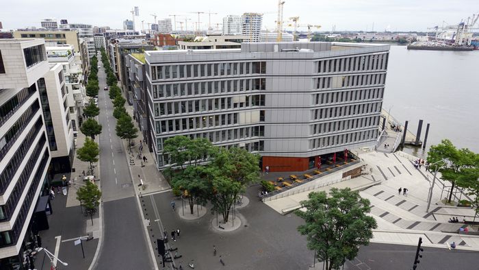 Построенная в шестидесятых годах прошлого века на 1111 бетонных плитах кирпичная коробка бывшего кофейного, табачного и чайного склада была расчищена до стен, а на ее плечи был водружен гигантский стеклянный фасад-парус, состоящий из 2200 окон, каждое из которых индивидуальной формы и стоило около 72.000 евро.