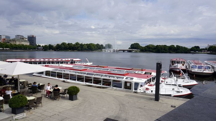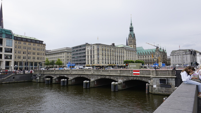 Доехав в район городской ратуши,да,опять туда же мы перекусили неизвестным блюдом,а это были жареные колбаски теста с карамельным и сливочным соусами,не спеша двинулись к двум небольшим озёрам или заливам Бинненальстер и Ауссенальстер.В них вливаются река Альстер и Лангерцуг.Ну и выливаются дальше.До Ауссенальстер,правда,не дошли,наш курс был на Шпайхерштадт.