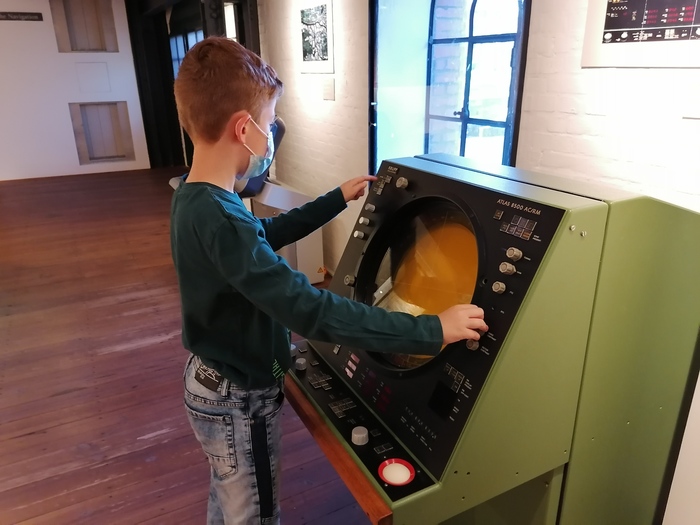 Один из интерактивных экспонатов -симулятор корабля, на котором может почувствовать себя моряком каждый желающий.Сыну далось пробиться сквозь толпу страждущих детей и поуправлять симулятором корабля-контейнеровоза.Бывший,настоящий и седой капитан рассказывал-куда крутить штурвал,на что обращать внимание,в каком направлении двигать махину контейнеровоза.