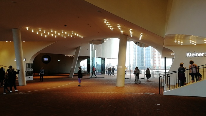 Поднявшись на эскалаторе мы попали в просторное фойе филармонии.Впечатлились высотой потолков и оригинальными,гнутыми в виде волны высокими дверями (или воротами) на террасу.Терраса или прогулочная палуба,тянется по всему периметру здания,чётко разделяя прошлое и настоящее,то есть отделяя кирпичное,вековое основание от нового футуристического стеклянного «паруса» верхней конструкции.