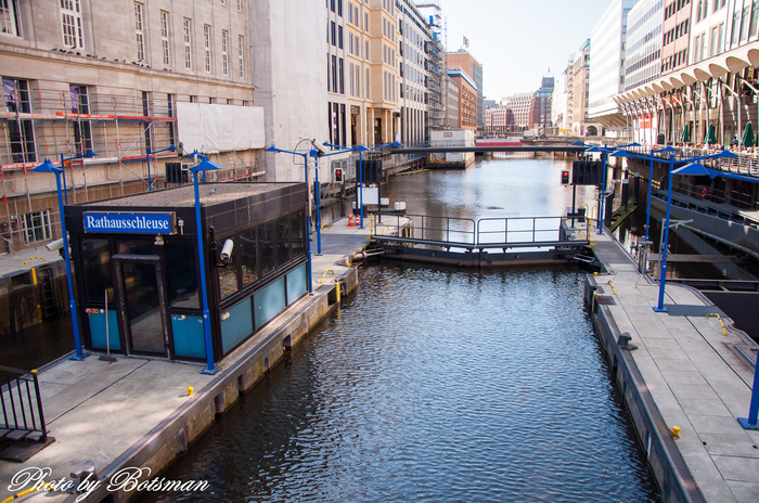 Для меня было удивительно, что в Гамбурге на каналах есть небольшие шлюзы. Именно в этот момент у меня произошел разрыв шаблона. Причем по многим параметрам. Во-первых, сегмент верхних ворот не опускается на дно, как на большинстве волжских шлюзов, а совсем наоборот – поднимается вверх. А во-вторых, в процессе шлюзования капитан просто ушел в кормовую часть к барной стойке и стал торговать кофе, лимонадом и другими напитками. Шлюзование завершено, надо выходить, однако торговля идет полным ходом. В этот момент место судоводителя занимает гид и уверенно выводит теплоход из шлюза. После этого экскурсия продолжается. А капитан продолжает торговлю. К второму шлюзу, все уже прикупили для себя все что хотели, и он занял свое место у штурвала.