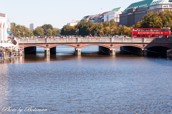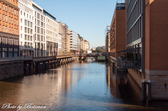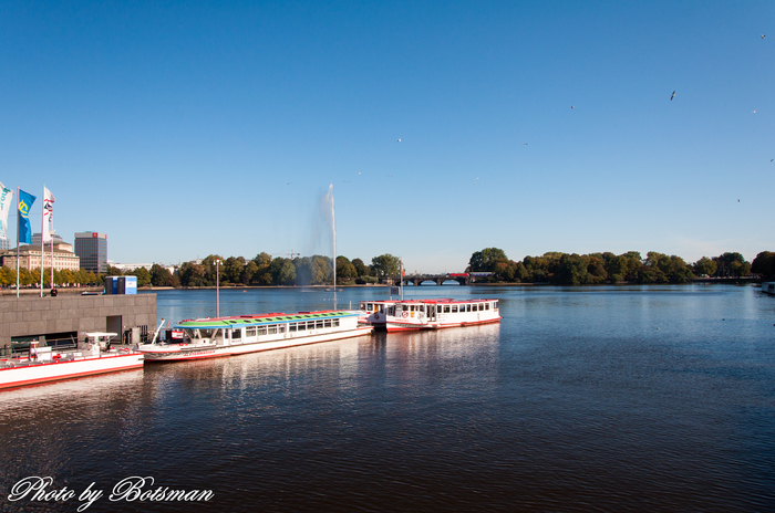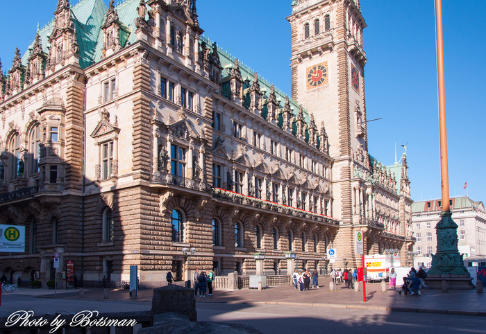 Моя прогулка по Гамбургу началась с Ратушной площади. Вообще впечатление от города оказалось двояким. Старинные, по-настоящему красивые и интересные здания, соседствуют с современными «новоделами». После такого даже Москва уже не кажется такой уродливой. А вот дальше, что-то пошло не так. На моем пути оказался причал с прогулочными теплоходами. До отправления теплохода на двухчасовую прогулку около 15 минут. Решено, еду! Без проблем покупаю билет и отправляюсь на борт. Теплоходик небольшой, но весьма уютный. Один большой минус – полностью застекленный. Из-за этого остался без фотографий. На корме есть некоторое количество открытых мест, но все они оказались занятыми и вообще там тесновато. Зато место судоводителя на виду. Никак не огорожено и все могут наблюдать за его работой. Управляют теплоходиком (так и хочется написать катерком) всего два человека. Один – это капитан, а второй – его помощник по совместительству гид. Вещание началось практически сразу после отправления судна в рейс началось вещание. Причем, экскурсия была с элементами интерактива. Гид время от времени обращался к туристам с вопросами, на которые они с большой охотой отвечали, а иногда просто в голос хохотали. Я бы это даже назвал не экскурсией, а бенефисом гида.