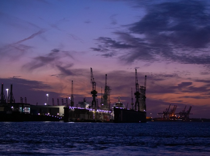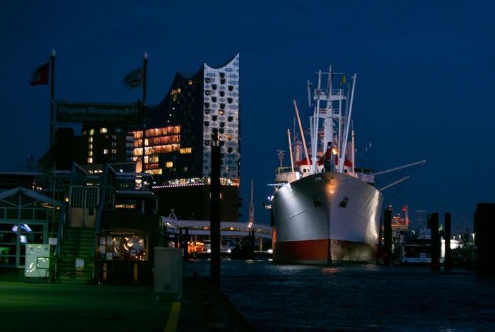 Признаюсь, с большим нетерпением я ждал момента отправления в рейс. Было действительно интересно узнать, как капитан будет выводить судно из узенького ковша порта, в котором стоял наш теплоход. На сей раз отправление было не столько торжественным, сколько трогательным. Теплоход отходил под красивую музыку. На другом берегу к моменту отправления собрались местные жители проводить теплоход в рейс. Это было очень хорошо видно мне с моего балкона. А вот с другого борта (со стороны терминала) из-за ограждения отплывающему судну махали руками сотрудники терминала. В лучах заходящего солнца, причудливо переливается облицовка здания филармонии. Как сказал наш русскоговорящий таксист, самое дорогое здание в Гамбурге, которое стоит 1 миллион евро. Очень жалею, что не добрался до смотровой площадки в филармонии. Хотя вид с 75 метров Святого Николая, как мне кажется, ничуть не хуже.