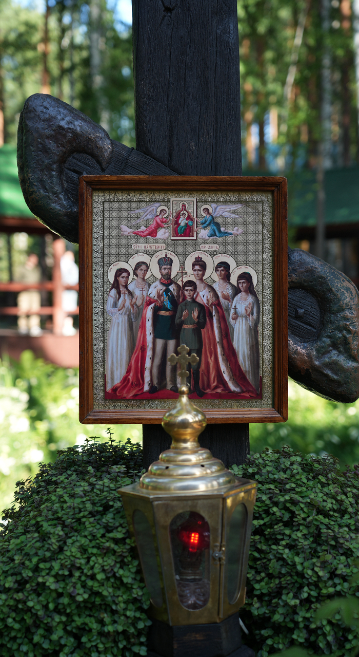 На поклонном кресте весит икона с царской семьей. Т.к.. я был в этом монастыре во время "царских дней", то к этому кресту и иконе подходило много паломников - читали молитвы и совершали различные религиозные ритуалы.