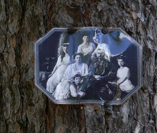 Речь пойдёт о маленькой фотографии, царской семьи, которую Вы можете увидеть прибитую к сосне. Эта фотография, по рассказу экскурсовода, является одним из чудес которые произошли здесь, а суть этого чуда в том, что после того как её прибил к дереву, один из паломников, в 2002г. она оказалась нетленной, в любую погоду она висит здесь и ей ничего не делается, простая, обычная фотография, к слову эти снимки я сделал в 2007г. Естественно, не являясь Чингачгуком, я приблизил фотографию оптикой и сделал снимок, вот он.