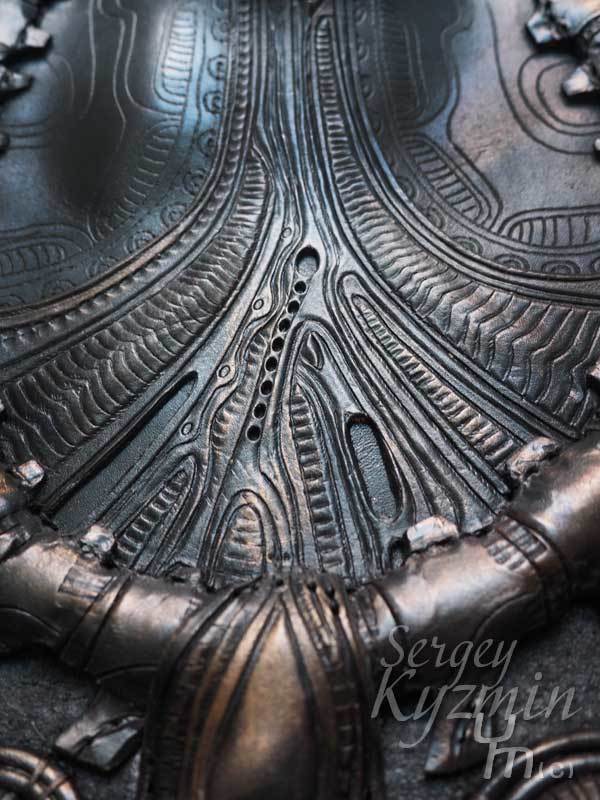 Первая большая работа в новом году. Новая сумка с королевой ксеноморфов. Все труднее не повторяться. Размер 38 х 30 х 12 см, 2 отделения, 2 кармана. Использовано 6 видов кожи. Предназначена для переноски ноутбука. Едет к своему будущему хозяину.
