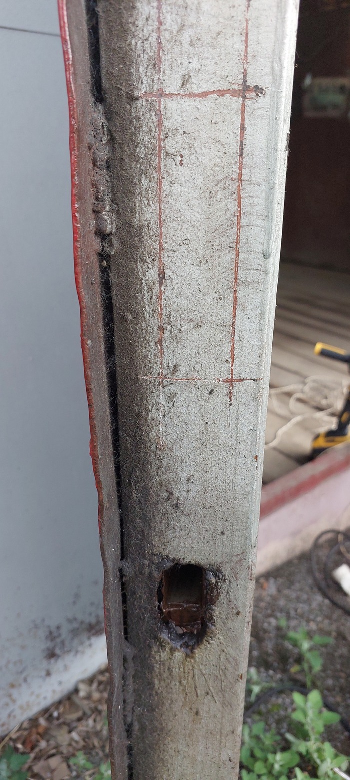 Тут, как вы видите, я уже врезал замок. В его установке абсолютно ничего сложного, снимаете размеры самого замка, переносите на каркас, вырезаете болгаркой паз и также сверлите отверстия под винты.