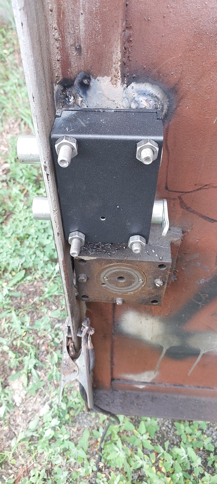 Кое-как выставив листы с заданным отступами от проема – прихватываю их к основному проему и прихватываю петли. Петли брал обычные (не каплевидные), пластины к ним нарезал из остатков уголка 75х75х5. При установке петель пользовался пластинками 2 мм, для выставления зазора, не забыв предварительно из смазать литолом.