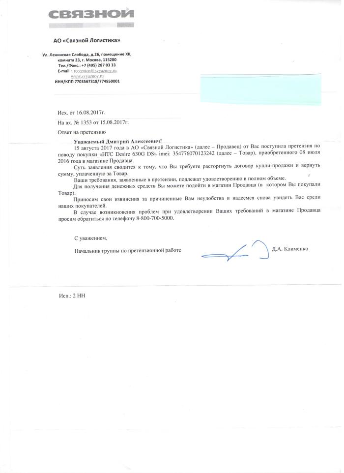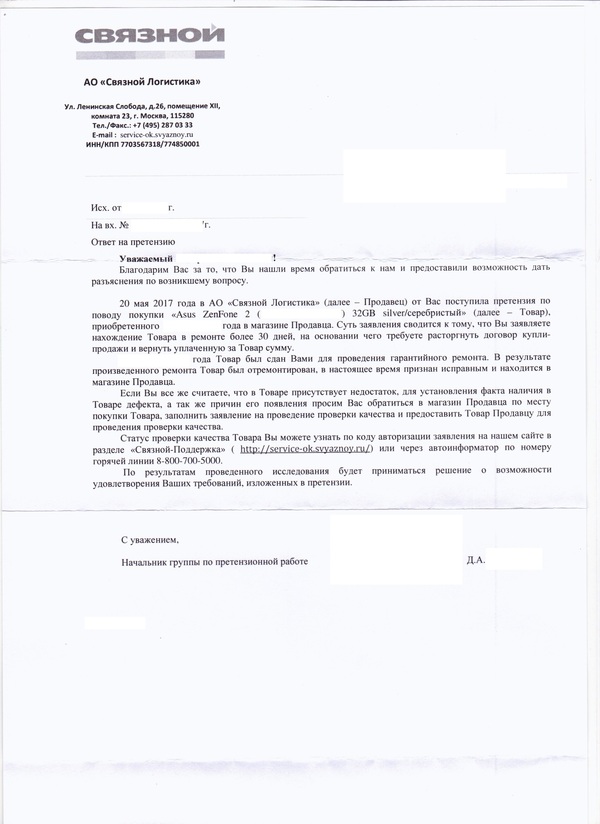 После принятия этого документа я долго общался с девушкой из отдела по работе с претензиями,, которая пугала меня статьями и 100% отказом, предлагали платный ремонт, либо идти к независимому эксперту, чтоб подтвердить производственный брак, естественно за мой счет, в общем я от всего отказывался и просил предоставить ответ в письменной форме от компании на мой адрес проживания, от чего они сначала отказывались под предлогом, что и устный ответ, с распечатанной бумажкой и печатью Салона в котором находился обладает юридической силой в суде. Я отказался и сделал правильно. Через 10 дней пришел вот такой ответ. Когда увидел конверт в ящике, вскрыл не сразу, так как начал искать время поход в Роспотребнадзор (мне ж обещали 100% отказ), и когда я его через 3 дня вскрыл, даже больше ради интереса о формулировке отказа, обнаружил это:
