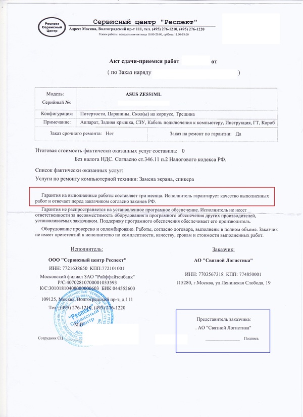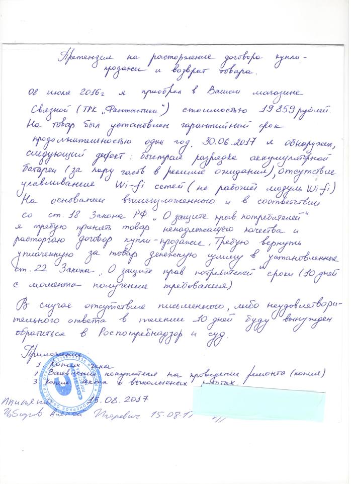 при проверке дома обнаружилось что дефект остался (был проведен только сброс настроек (что я и сам собственно умею) в СЦ и эту информацию мне подтвердил позже в претензионном отделе сотрудник данной организации), при повторной сдаче 24.08.2017 (не сразу, так как уезжал в командировку срочную), прибор забрали и 14.08.2017 пришла смс, мол прибор готов, приходите, забирайте, я довольный пошел в салон связи, а вот там мне уже сказали, что это не гарантия, т.е. пришел отказ, типа платите и все исправим (Причина такая, что по 20 статье "о защите прав потребителя", гарантийный срок продлевается только на срок нахождения его в ремонте, то есть как мне сказали в претензионном отделе "если бы Вы даже вышли из салона проверить Вайфай модуль, (так как в салоне нет возможности для проверки) он уже был бы не на гарантии,(они посчитали что гарантия действовала до 21.07 своей странной математикой) можем вам помочь только отказом, или идите к независимому эксперту, и если докажете производственный брак, примем на ремонт\вернем деньги\оплатим экспертизу"
