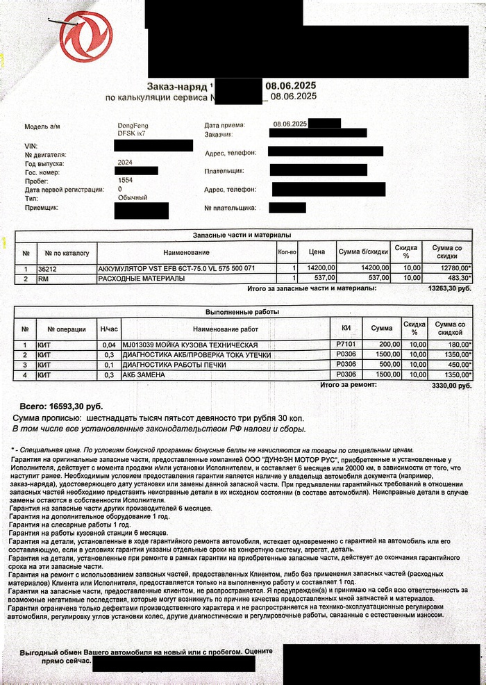 Через три часа мне позвонили и сказали, что машину можно забирать. Результаты диагностики подробно описаны в заказ-наряде, что будет ниже, но в двух словах так - АКБ работает нормально, печка работает нормально, утечек нет, проблем нет, с вас 10 тыщ. Я уточнил, тщательно ли они диагностировали, особенно аккумулятор, ведь проблема точно есть. Мне ответили, что я могу побеседовать с бригадиром как приеду, он даст подробные комментарии по диагностике, а пока мой аккумулятор поставили на подзарядку, наверное он просто был недозаряжен. Также добавили, что наверное двери или багажник был открыты долго, а там включаются светодиодные лампочки, которые и сажали аккумулятор, что на мой взгляд звучало как бред. Морально начав готовиться к худшему, я сел в такси и поехал в автосалон. По приезду менеджер сервисного центра (далее МСЦ) сказал, что есть новости - аккумулятор действительно с дефектом, он не заряжается до конца. То есть сервис признаёт, что проблема есть, и она в аккумуляторе. Однако, этот случай не является гарантийным, поскольку АКБ в принципе не подлежит гарантийной замене. Он также сказал про какие-то первые две недели, которых вообще в договоре нет. Я с этим не согласился, достал договор и указал на пункт 4.3 (таблица), где аккумулятора в основном перечне нет, а значит его можно отнести к последней строке "все элементы, не оговорённые выше" и срок его гарантии составляет 6 месяцев. МСЦ возразил мне и указал на пункт 4.14.7 договора, где АКБ находится в списке расходных и смазочных материалов, подверженных износу при нормальной эксплуатации, то есть гарантия на него не распространяется. Я с этим не согласился, уточнив что в этом пункте говорится про износ. А о каком износе может идти речь, если на момент обращения в мае машина не проехала даже тысячи километров, и прошло всего полтора месяца после покупки, при этом по факту проблема давала знать и раньше. Автомобиль новый, значит и АКБ новый, а значит должен подлежать гарантийной замене. Этот довод смутил МСЦ, он предложил позвонить менеджеру продаж (далее МП), который проводил мне сделку по покупке автомобиля, якобы это его отдел занимается АКБ. Я не очень понял, как это связано, но поскольку я лично видел этого менеджера утром, решил набрать ему и пригласить к нам, чтобы разобраться в ситуации. МП взял трубку и ожидаемо ответил, что он тут вообще ни при чём, подойти в любом случае не может, и надо звать менеджера гарантийного отдела (далее МГО). Я сказал, что не знаю, как у вас заведено, мне МСЦ сказал позвонить вам, я и позвонил. Далее МП перезвонил МСЦ, сказал ему примерно то же, что и мне, кто-то из них вызвонил МГО и мы стали ждать его. Спустя какое-то время МГО появился, и у нас состоялся примерно следующий диалог:
