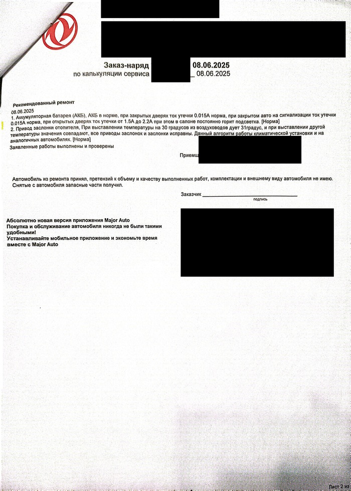 Далее МГО передал моё пожелание МСЦ и удалился, тот позвонил руководителю салона (далее РС) и отправился за ним. С его слов это был не просто руководитель, а руководитель всего комплекса Major. Не знаю, кто он на самом деле по должности, но по крайней мере это был куда более приятный в общении человек по сравнению с МГО. РС поинтересовался, хочу ли я поговорить с ним здесь, у сервисного центра, или в переговорной. Я выбрал переговорную, и мы проследовали с ним туда. Я спросил, в курсе ли он ситуации и предпочтёт ли короткую или длинную версию событий. Он сказал, что немного в курсе, но короткая версия точно не гарантийный случай. Тогда я изложил ему полную версию всех событий выше. РС сказал, что понимает меня как потребителя, но они действительно подчиняются некоторым правилам и инструкциям. И вот здесь я совершил, на мой взгляд, главную ошибку. Не дожидаясь предложения от РС, я сразу предложил компромисс. Я уточнил, если бы это был гарантийный случай, то взял бы тогда автосалон все расходы на себя? РС подтвердил. Давайте тогда, говорю, я оплачу диагностику, коль скоро работы всё же были проведены, но вы замените мне АКБ на новый бесплатно. РС ответил, что так они не могут сделать, но могут сделать с точностью до наоборот. Я оплачиваю покупку нового АКБ, а диагностику они мне проводят по минимальному прайсу. Кроме того, на итоговую стоимость автосалон сделает мне скидку в 10 процентов. Устроит ли меня такой вариант? Немного подумав и сделав вывод, что так хотя бы машина будет ездить без проблемы с аккумулятором, я согласился. На этом и порешили, РС отдал указания МСЦ, он в свою очередь техникам, попросил побыстрее, и через час машина была уже с новым АКБ. Я оплатил и попросил дать мне бумаги, где будет указано, что старый АКБ имел дефект. МСЦ заверил меня, что все бумаги будут лежать в машине. Здесь я совершил ещё одну ошибку и не затребовал их в руки здесь и сейчас. Наконец машина была готова, мне вернули ключи, я попрощался и пошёл в машину. В машине я обнаружил следующие бумаги: