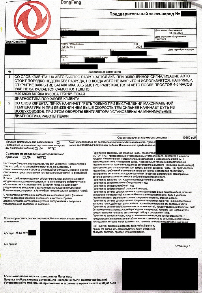 Наконец наступает 8 июня и начинается самое интересное. Порядок действий мне определили такой: я сначала сдаю машину на диагностику, несколько часов её тщательно проверяют, затем выносят вердикт, является ли случай гарантийным или нет. В зависимости от этого либо делают ремонт по гарантии, если случай гарантийный, либо я оплачиваю диагностику в полном объёме, если нет. Я взял все имеющиеся документы по машине с собой, приехал, сдал машину в сервис и отправился по своим делам. Ещё при записи по телефону и при сдаче машины на диагностику мне озвучили сумму, которую я должен буду заплатить при негарантийном случае по обеим проблемам - 10550 рублей. Вот предварительный заказ-наряд: