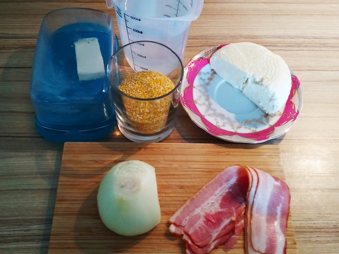 Одновременно с варкой мамалыги, чистим лук и нарезаем его на четвертинки. В сковороде растапливаем бекон или сало и обжариваем на нем лук. Сыр нарезаем кубиками.
