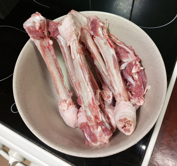 Лирическое отступление: да, с голенями, пока добудешь с них мясо, придётся повозиться. Но здесь, как и в любом кулинарном процессе важна привычка. В первый раз я скрипел зубами и матерился, в третий раз было заметно легче и быстрее, раз на шестой уже делал на автомате. Мясо голеней по текстуре и вкусу совершенно ничем не отличается от филе бедра, меж тем бедро без костей в первопрестольной дешевле 500 руб. за кило не найдёшь. А чистого мяса из голеней получилось 1,8 кг, плюс остались кости и некондиционные ошмётки для бульона.