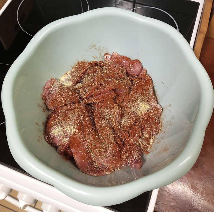 Дальше всё проще некуда. Включаем обратно нагрев, перемешиваем мясо с луком.