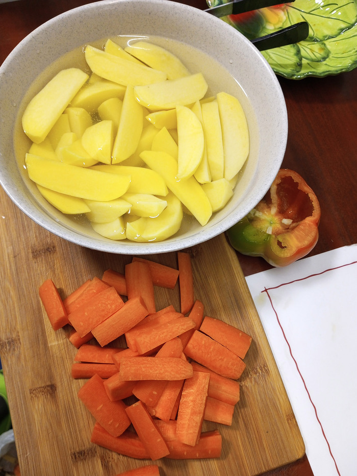 Три среднего размера морковки режу просто «поленьями». На фото есть ещё картофель, но о нём разговор будет отдельный. Чеснок нарезаем произвольно, одну дольку на 3-4 части.