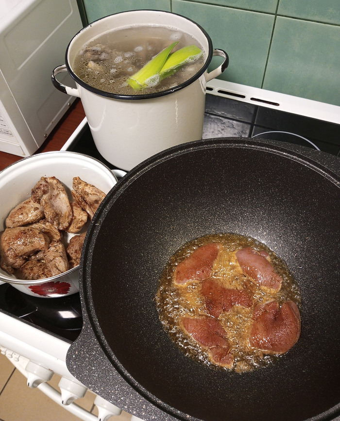 Пока варится бульон, занимаемся мясом. Мне удобнее всего использовать казан, но жаровня тоже подойдёт. Хорошенько разогреваем масло и порционно обжариваем куски до небольшого румянца. Если не зарываться и класть по несколько кусков, обжарка идёт быстро, мясо не варится и не тушится в собственном соку.