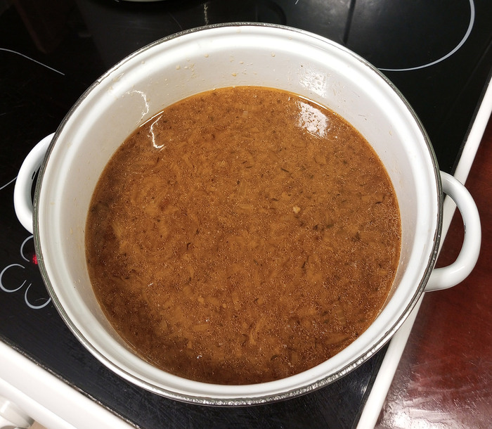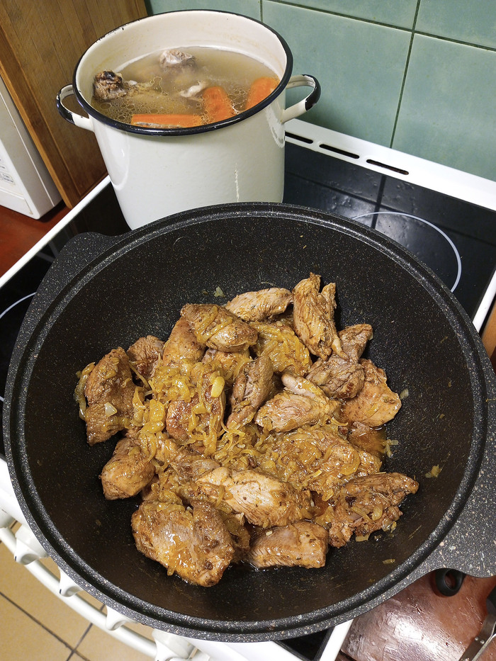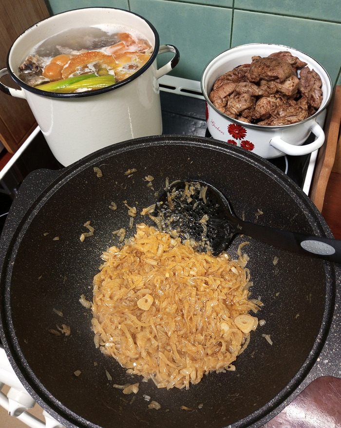 Закончив с индейкой, тут же в «мясное масло» бахаем чеснок, ждём, пока подрумянится, и вываливаем лук. Лук жарим долго — до карамельного цвета и «сопливой» консистенции. Приготовился — что ж, можно сделать перерыв минут на 15-20, перекурить и дать бульону довариться.