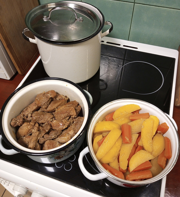 Когда всё приготовилось, я сложил индейку в одну кастрюльку, овощи — в другую, а в третью — полтора литра подливки.