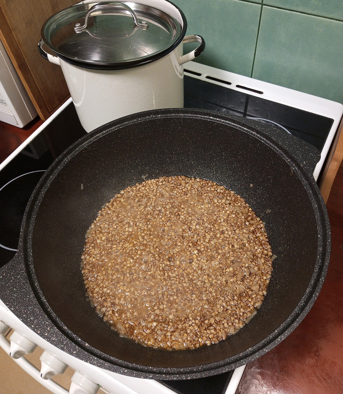Так, стоп — сказал я себе, — а куда мне её столько? И, пока казан был еще не вымыт, влил туда литр подливки, довёл до закипания и засыпал 500 г промытой гречки. Варю её я всегда единственным способом — как только над крупой не стало видно жидкости, снимаю «тару» с плиты и укутываю шерстяным одеялом. Гречка никогда не переварится и останется рассыпчатой.