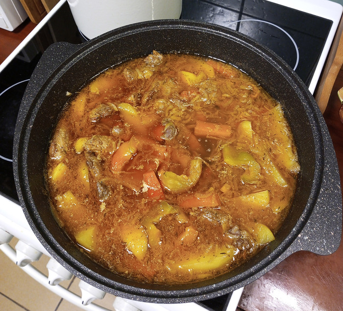 Накрываем крышкой, регулируем нагрев так, чтобы тихонько булькало и оставляем на 40-50 минут — ориентируемся на готовность моркови. За 10 минут до предполагаемой готовности солим — на указанное количество мне потребовалось 20 граммов.