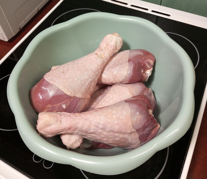 В этот раз мне попались «акционные» голени индейки по 149 руб. за кило. И хотя ноги были не сильно накачанные, капризничать я не стал и приобрёл шесть штук общим весом 2,95 кг (442 руб.).