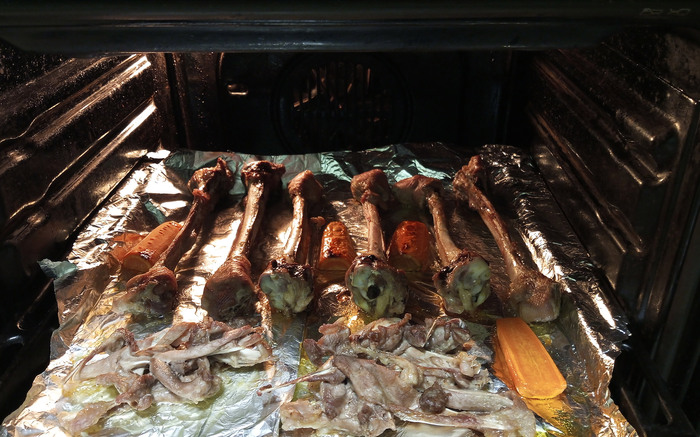 Срезав мясо с голеней, я замариновал его в специях и оливковом масле, а кости поставил в духовку запекаться — из них должен был быть сварен бульон. Есть время почистить и нарезать лук и морковь.