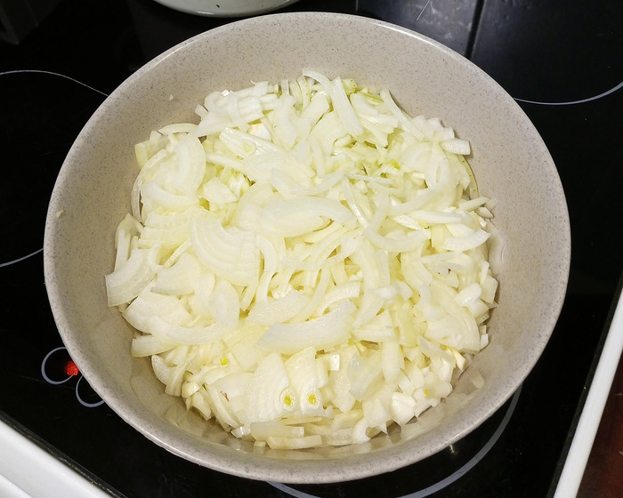 Лук в данном случае жалеть не стоит — во-первых, он даёт вкус, во-вторых, сколько ни положи, всё равно сильно ужарится. Я обычно беру половину от веса мяса — в данном случае около килограмма. Нарезаем «четвертькольцами».