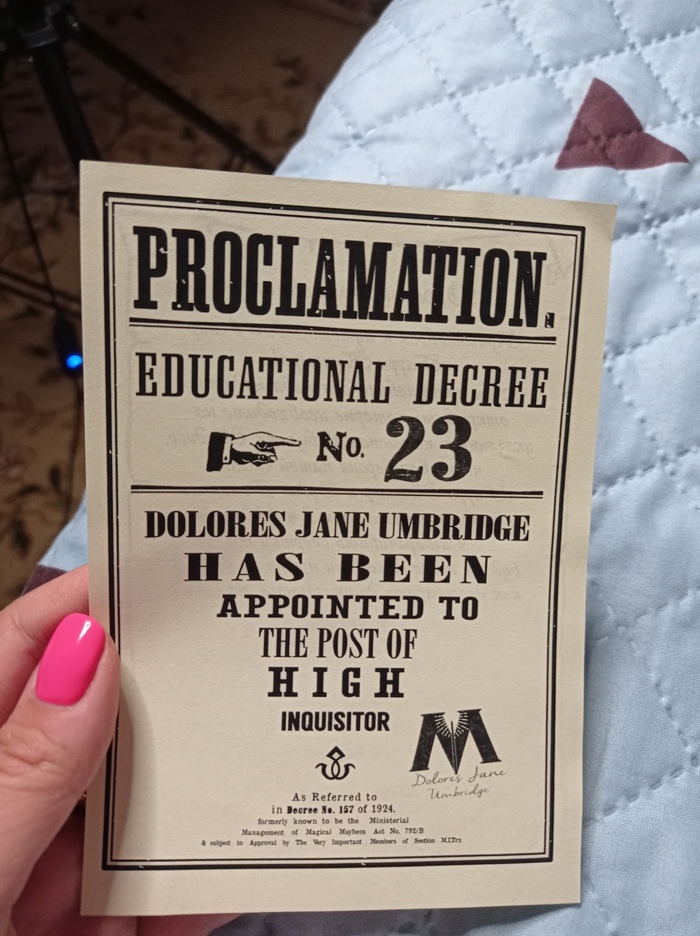 Далее тетрадь в виде книги, что бы можно было скрытно записывать защитные заклинания, которые Амбридж запретила изучать.