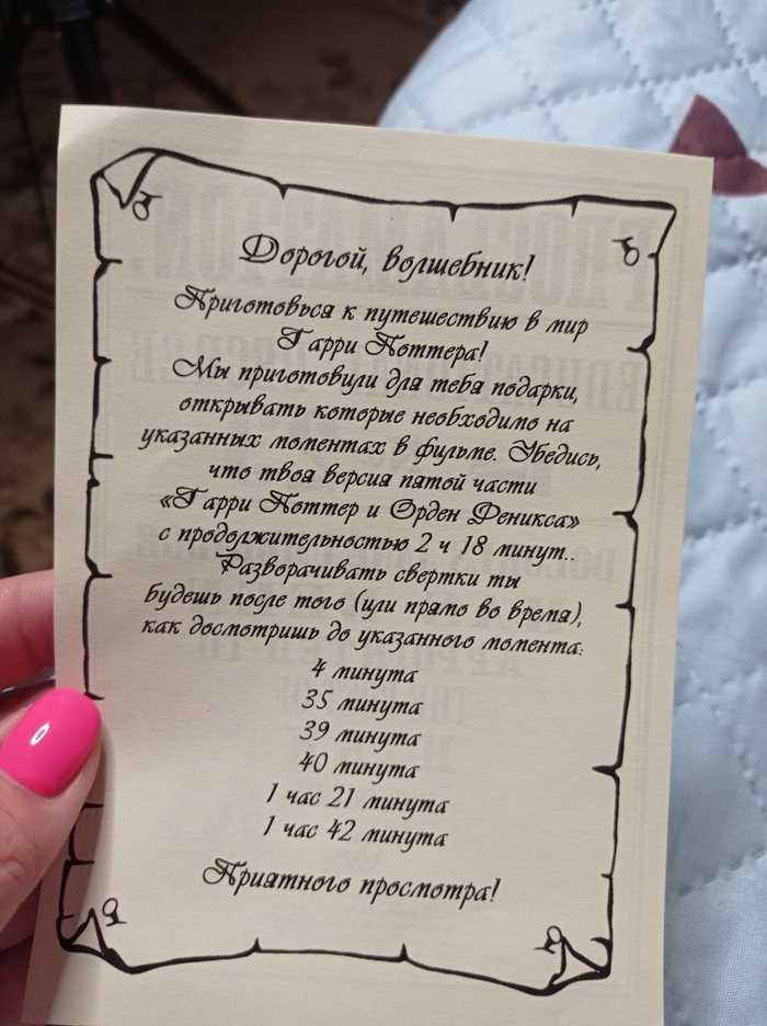 Внутри меня ждали 6 свертков, 2 открытки, магнитик, стикеры наклейки, список армии Дамблдора и конечно же выпуск ежедневного пророка. Все по тематике этой части фильма.