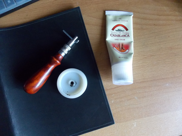 Теперь берем любой обувной крем на восковой основе, наносим немного на край и сликером (белый кругляш на фото) сглаживаем края.