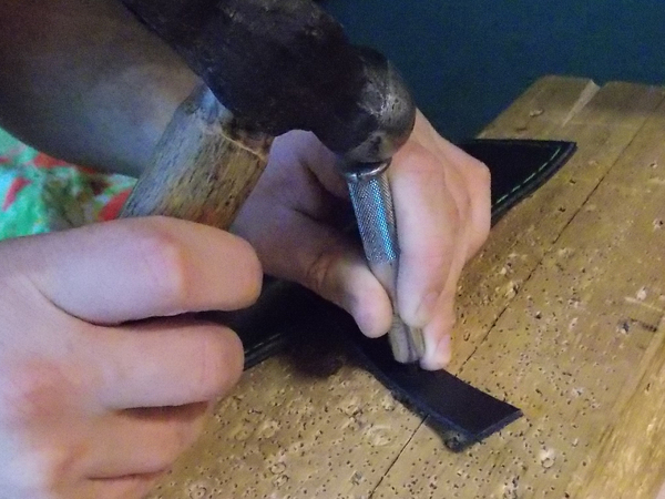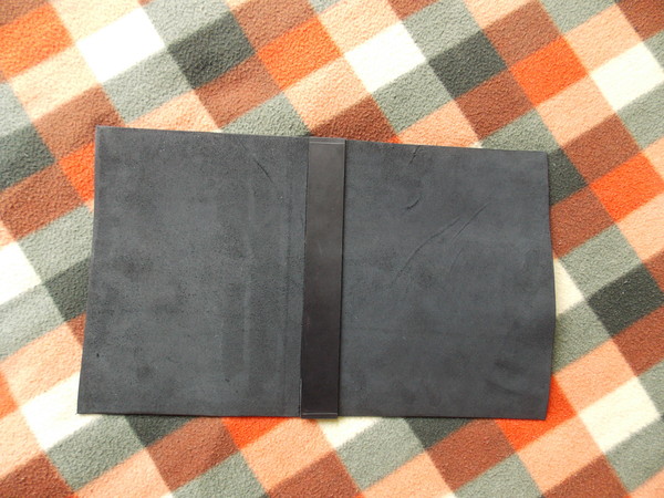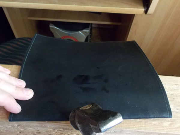 После того, как прокладка приклеена, нужно сформировать сгибы - смачиваем средний участок на внешней стороне обложки (т.к. мокрой коже легче придать форму), сгибаем нашу обложку и молотком хорошенько простукиваем сгибы.