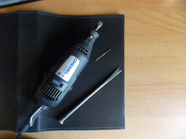 Теперь с помощью нехитрых устройств нужно сделать дырочки. Усовершенствованным гвоздем с двумя остриями (шаговый пробойник) намечаем места будущих дырок (пробойник помогает сделать между ними одинаковое расстояние), а затем дремелем сверлим аккуратные отверстия.