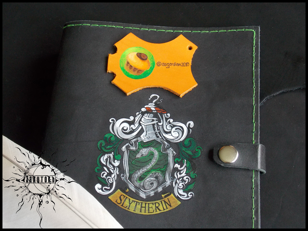 Когда наше изделие полностью прошито, можно наносить рисунок - если он требуется. Заказчик пожелал тетрадь с гербом Слизерина - так тому и быть. Берем карандаш, ластик, а для того, чтобы рисунок никуда не съехал - с помощью линейки отметим середину обложки (это действие не обязательно, если у вас хороший глазомер). И рисуем!