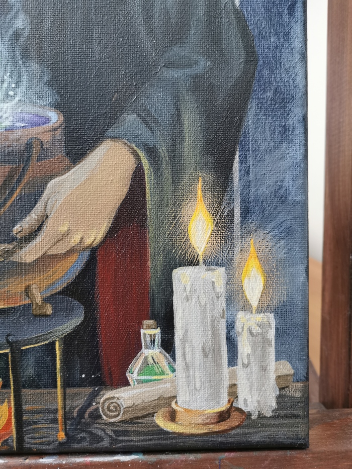 За основу я взяла образ именно киногероини, потому что она, всё-таки, роднее) Гермиона варит полный котелок зелья, зачем? Я сама не знаю, зачем ей так много 😄Рядом её патронус - выдра.