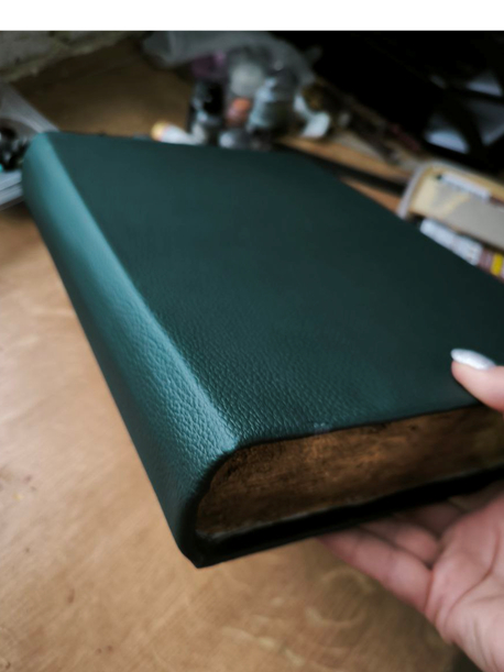 И нет бы нам остановиться уже, так не же. Пришла следующая идея. Тема со змеиной кожей побеждала, и захотелось пойти дальше. Я прям представила ткань под змеиную кожу, немного переливающуюся, чешуйчатую текстуру. Нашли на озоне подходящую. Заказали. Ждали еще несколько дней. В итоге наконец-то приехала, обтянула я книгу. Иииии! Вот она! Именно то что нужно.